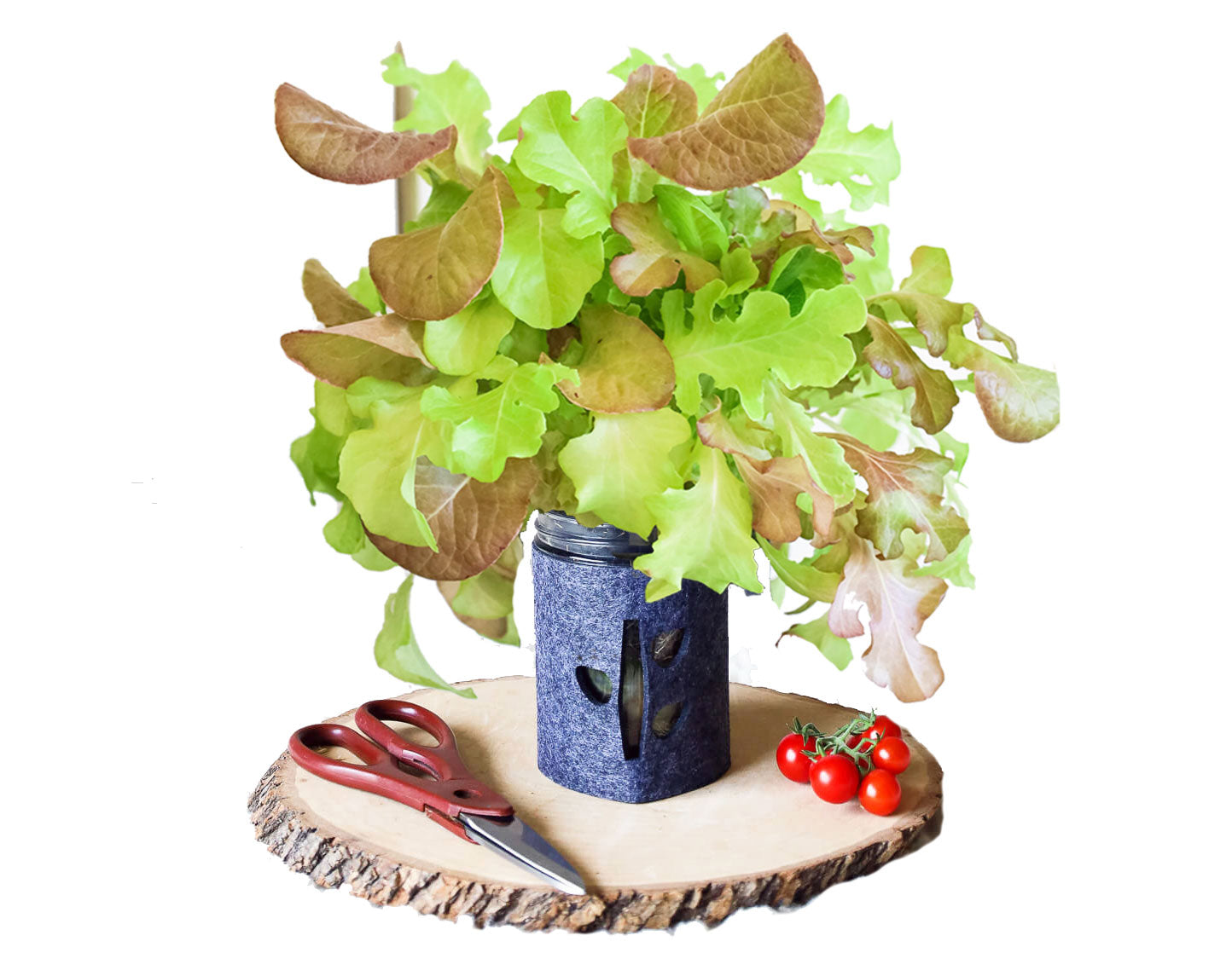 The kit comes with all of the components you need to start growing plants: a 16 oz Mason Jar, protective cover, bamboo plant label, net pot, clay pebbles, non-GMO seeds, growing pod, dry nutrient mix, cotton wicking string, and directions.